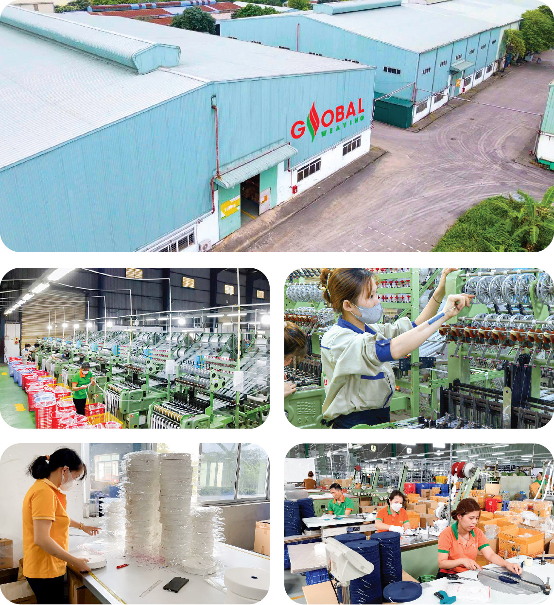 The Factory is a modern production facility of Global Weaving Joint Stock Company, including 4 textile workshops such as: Comez Knitting, Jacquard Loom, Braiding, Flat Knitting Equipped with leading advanced technology in the production of auxiliary materials for the textile and garment industry. The factory is located in a strategic location, which is convenient for transportation and connection with domestic and international partners.